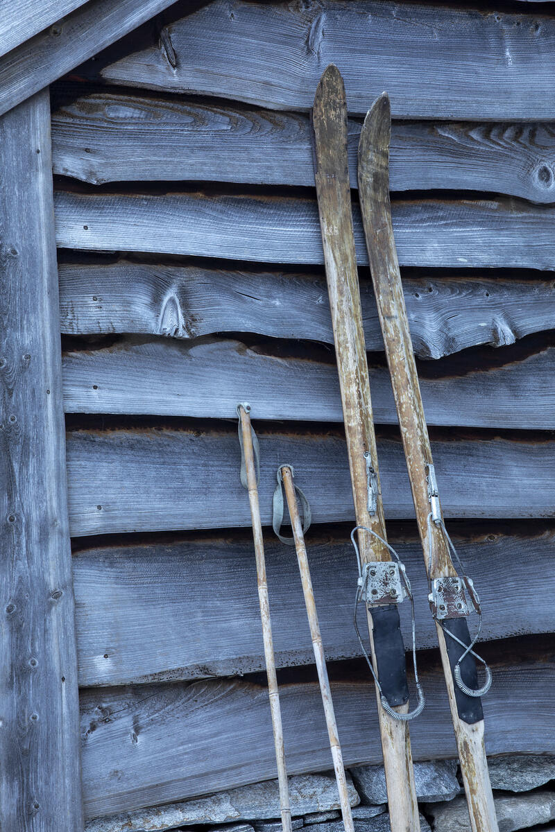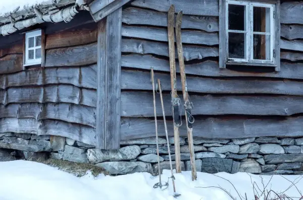 Nærbilde av ski opp mot Bjørn Westhytta i Matre Silje Katrine Robinson | Stiftelsen Museum Vest - 2/5