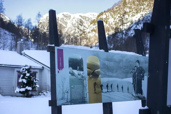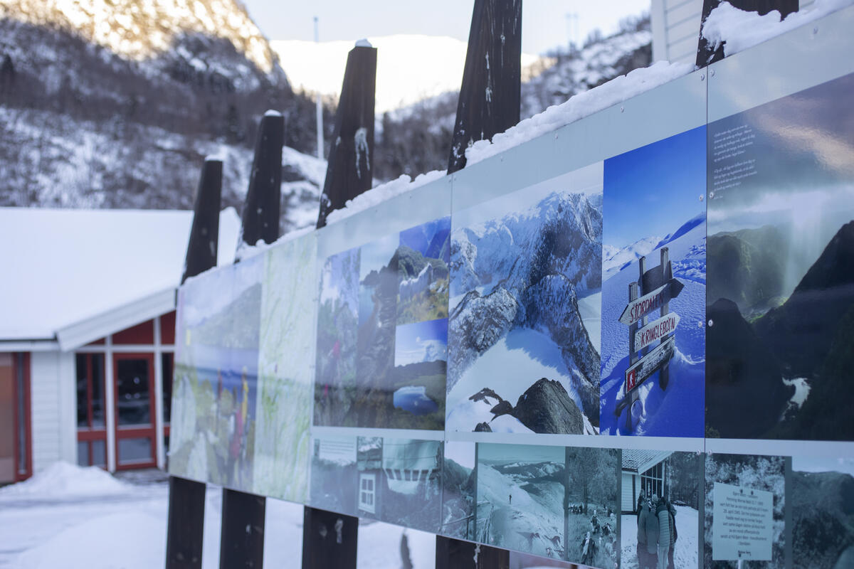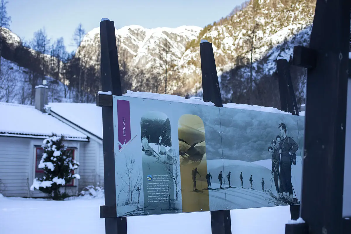 Outdoor exhibition with photo and illustrations from the Masfjord mountains from the winter of 1944/45 and present.
